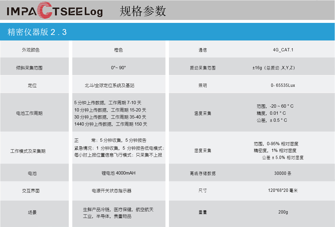 是PRMIERSE系列沖擊記錄儀的旗艦型號,便攜式精密儀器版2.3系列產品是基于CAT.1_ 4G通信技術和ITO技術的記錄儀,用于收集和監測各種數據,如溫度、濕度、照度、傾斜值、振動值、位置等。