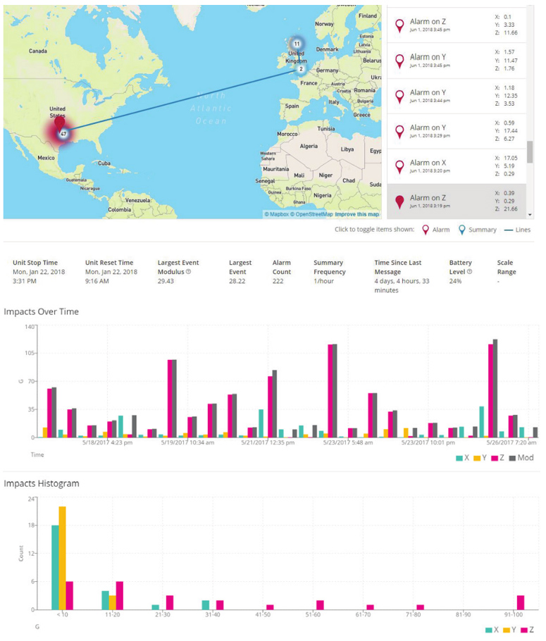 ShockLog?Cellular使您能夠知道您的貨物正在安全地運送到它們的目的地,如果發生了什么錯誤,您就知道問題發生的時間和地點。