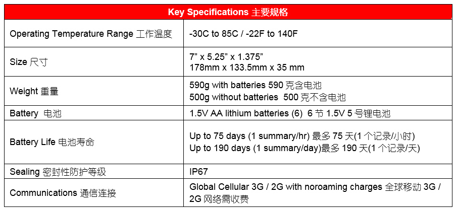 當您的貨物遭受超差沖擊、溫度、濕度、傾斜或滾轉時,此設備會發出警報。