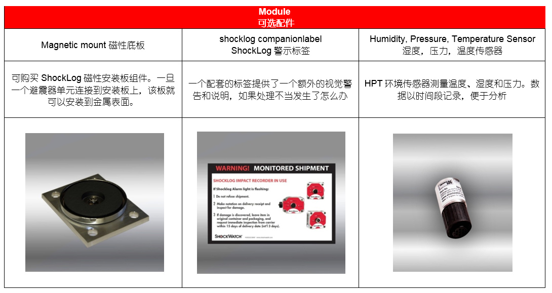 ShockLog 沖擊記錄儀可額外增加配件,使它從多方面監測記錄其他有可能影響貨物和設備的不同環境