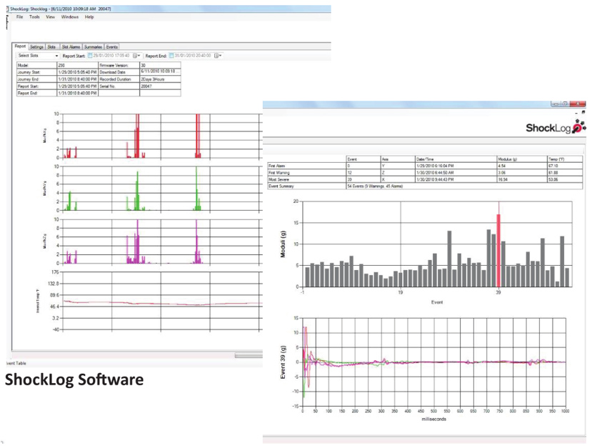 ShockLog 298監測撞擊事件、振動、并提供內部溫度峰值(時段)和總結詳細的行程數據。